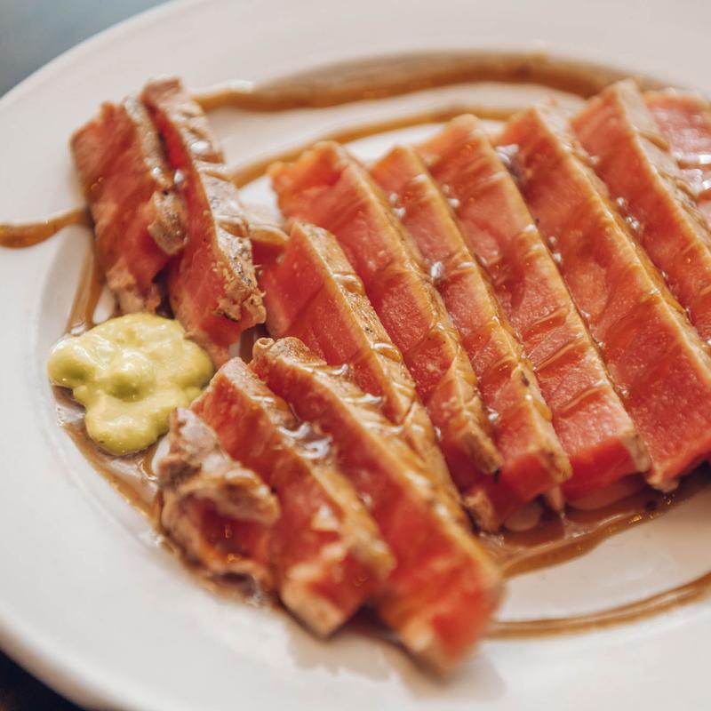 Seared ahi tuna served with house-made wasabi sauce, Asian sesame dressing, and soy sauce
