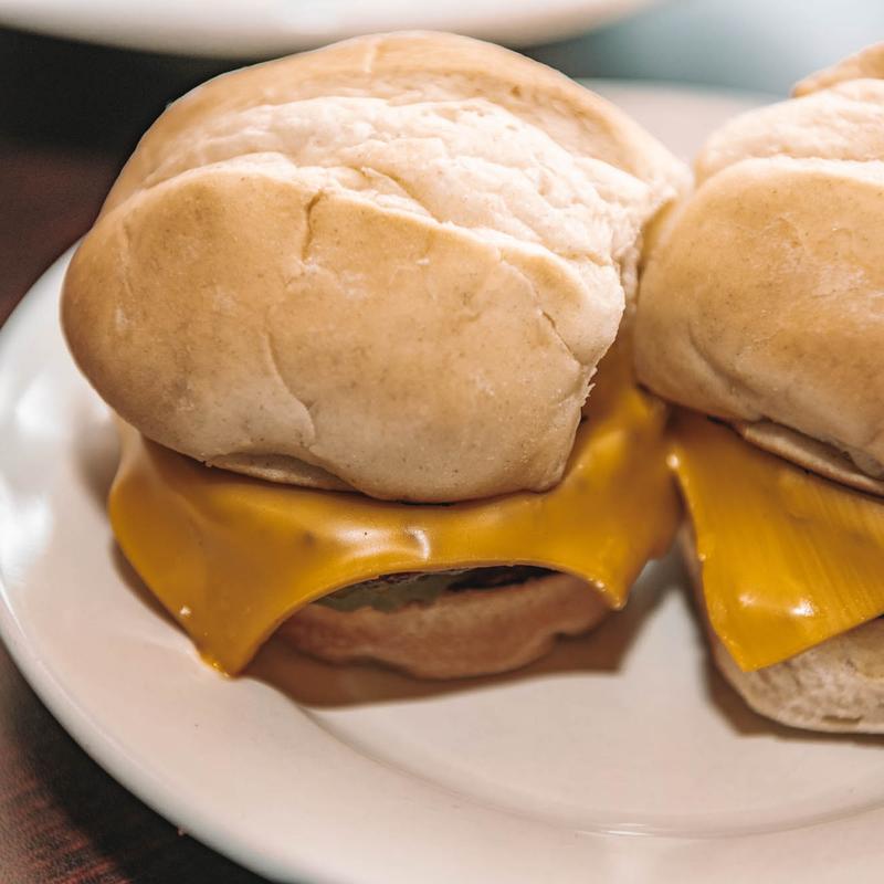 Two mini burgers topped with American cheese, pickles, and our signature toad sauce on toasted slider buns