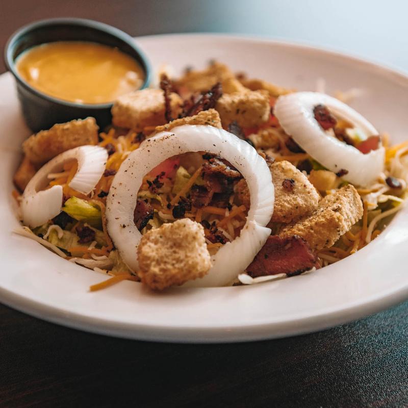 Side $6.00 | Full $11.00 • Fresh leaf lettuce, mixed cheese, tomatoes, cucumbers, onions, bacon crumbs, and croutons