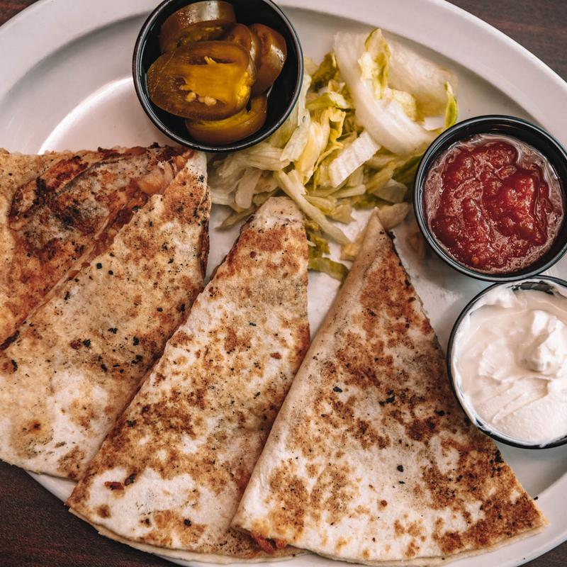 Grilled tortilla loaded with grilled steak and mixed shredded cheese. Served with sour cream, salsa, lettuce, tomatoes, and jalapeños