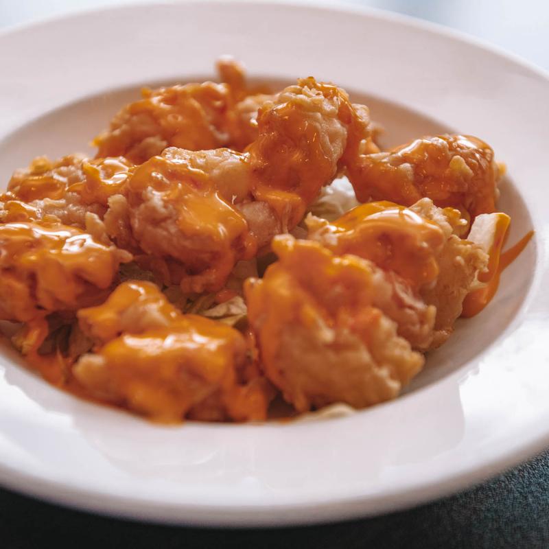 Crispy fried shrimp tossed in zesty boom boom sauce served over a bed of lettuce
